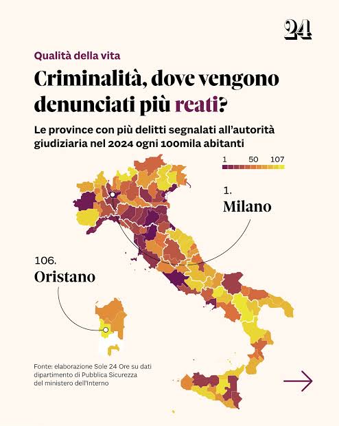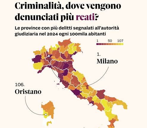 Come ogni anno, il Sole 24 Ore ha pubblicato una classifica inerente l’indice della criminalità nelle città italiane. In crescita sono i reati denunciati in Italia con un +1,7% su base annua registrato nel 2024. Le città più pericolose sono Milano, Firenze e Roma, che vincono i primi posti come le peggiori. In particolare, Milano è in pole position come capitale del crimine. Le più sicure, invece, sono le piccole province di Oristano, Potenza e Benevento. Un incremento di crimini che vede prevalentemente la criminalità di strada e i reati predatori ma che sembrerebbe un trend non confermato nel primo semestre del 2025 dove invece risulta in calo rispetto allo stesso periodo dell’anno precedente. Nel dettaglio, lo scorso anno, il boom di denunce c’è stato per furto che ha costituito il 44% di tutte le denunce di reato (+3%), tra cui: i furti in abitazione (+4,9%) seguiti dai furti di autovetture (+2,3%). In aumento anche le rapine (+1,8%), i reati legati alla droga (+3,9%) le violenze sessuali (+7,5%) le lesioni dolose e, infine, i danneggiamenti. Nella nostra regione, invece, troviamo Napoli che, pur occupando i primi posti nei reati di contrabbando e usura, nella classifica generale della criminalità, si posiziona al 13esimo posto con oltre 4400 denunce ogni 100mila abitanti, in calo rispetto all’anno precedente, 132000 totali. Come 43esima troviamo Caserta, con 30.986 denunce totali, pari a circa 3.414 ogni 100mila abitanti, e una variazione in aumento dell’1,80% rispetto all’anno precedente. Un dato che, pur collocando la città nella seconda metà della classifica, evidenzia un lieve peggioramento, in particolare per i reati predatori e quelli legati alle tensioni sociali ed economiche. Caserta è al secondo posto per l’usura (1,1 denunce ogni 100mila abitanti), al quarto per omicidi volontari (1,3 denunce ogni 100mila abitanti), per il contrabbando (0,8 denunce ogni 100mila abitanti) e rapine agli uffici postali (0,8 denunce ogni 100mila abitanti), al sesto per furti d’auto (447,7 denunce ogni 100mila abitanti). Occupa però il penultimo posto per le violenze sessuali (5,8 denunce ogni 100mila abitanti), 102° posto per i danneggiamenti (220,7 denunce ogni 100mila abitanti), 97° posto per le frodi informatiche (352,8 denunce ogni 100mila abitanti). Le città campane più sicure sono: