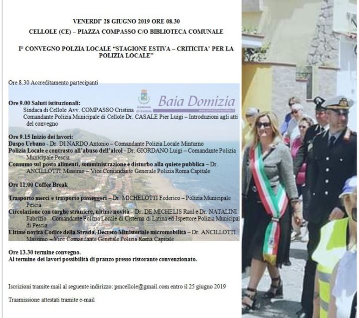 Si terrà venerdì 28 giugno 2019 alle ore 9.00, nella sala conferenze della biblioteca comunale in piazza Compasso, il I° convegno Polizia Locale “stagione estiva – criticità per la polizia locale” organizzato dal comune di Cellole, nella persona del Responsabile Area Polizia Municipale, dott. Pierluigi Casale.