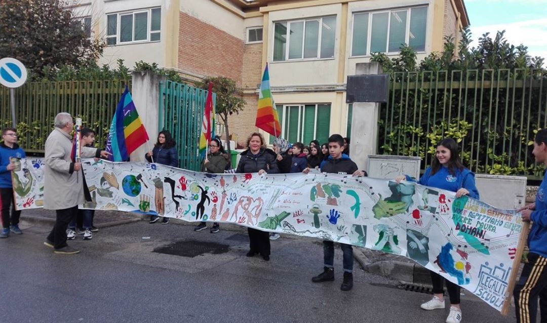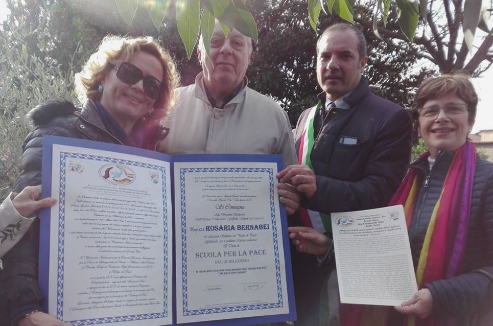 “Le tappe di quest’anno hanno proseguito il percorso, ricordando dai 100 anni ad oggi, significativi avvenimenti accaduti nel corso degli anni. Ecco perché in occasione della ricorrente data prescelta con la scuola, è stato ricordato il 71° Anniversario della Dichiarazione Universale dei Diritti dell’Uomo ed il 30° anniversario della caduta del muro di Berlino”. Ha fatto sapere Agnese Ginocchio, Presidente dell’ente promotore della storica mobilitazione, presente con il vice Presidente, nonché braccio desto della Ginocchio, prof. Gino Ponsillo. Lo storico evento culminato con la sigla del Patto di Pace tra la Scuola per le mani della Dirigente scolastica Bernabei ed il Movimento per la Pace per le mani della Presidente, attraverso il quale è stato consegnato il titolo di “Scuola di Pace del III Millennio.