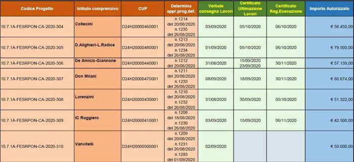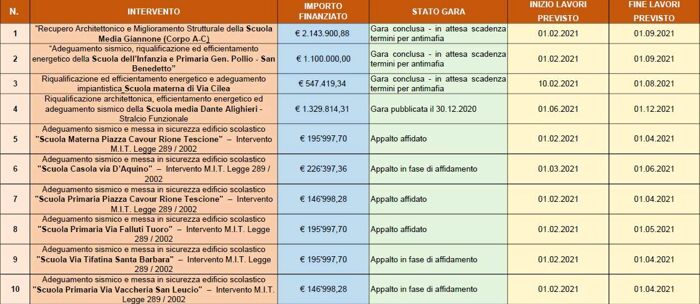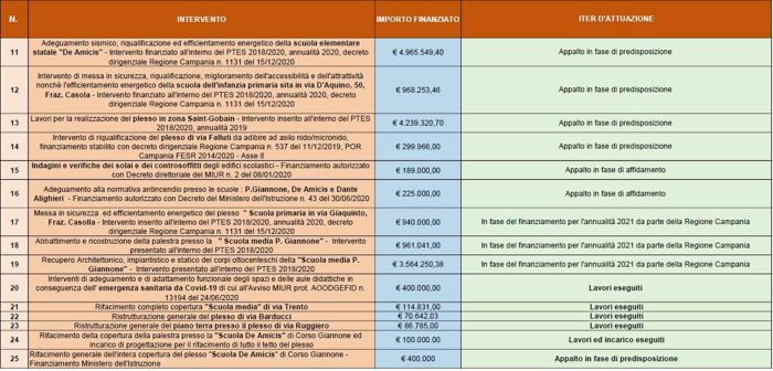 L’Assessore ha poi analiticamente esposto la ripartizione dei finanziamenti in relazione agli istituti casertani che indichiamo nel prospetto qui di seguito allegato: obiettivo dell’amministrazione comunale e’ l’adeguamento sismico e la riqualificazione energetica del patrimonio scolastico.