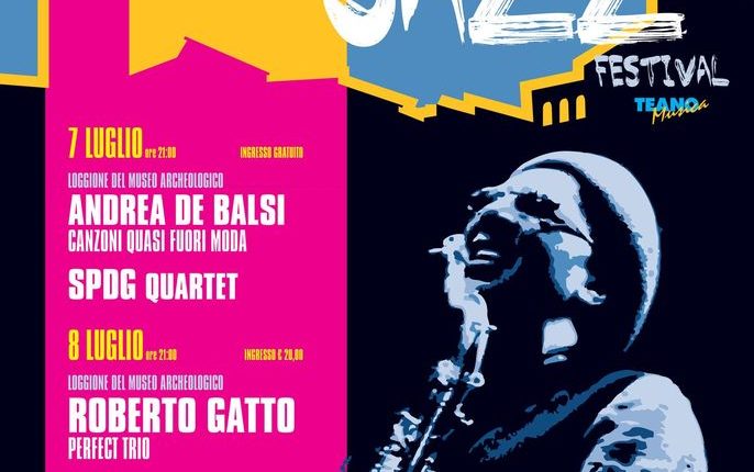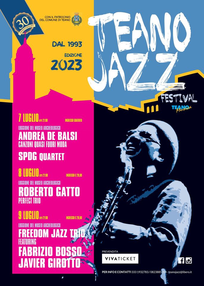 Nel trentennale della rassegna il Teano Jazz Festival ospita tre importanti artisti del panorama nazionale e internazionale, Roberto Gatto, Fabrizio Bosso e Javier Girotto.Gli spettacoli si svolgeranno, con il patrocinio dell’Amministrazione Comunale di Teano, nella splendida e storica cornice del Loggione del Museo Archeologico nei giorni del 7, 8 e 9 luglio.Il 7 luglio apre la rassegna il cantautore Andrea de Balsi che presenta il suo ultimo lavoro “Canzoni (quasi) fuori moda” accompagnato da Domenico de Marco alla batteria, Alfonso Camarota al basso elettrico, Angelo Mastrangelo al piano e Alfredo de Francesco al sax contralto. A seguire, l’esibizione della formazione “SPDG Quartet”, eccellente gruppo campano con Lello Petrarca alle tastiere, Domenico de Marco alla batteria, Lello Somma al basso elettrico e Guido della Gatta alla chitarra.L’8 luglio sarà la volta del “Roberto Gatto Perfect Trio”, trio ricercato e intrigante, dall’empatiapazzesca, formato da Roberto Gatto alla batteria, Alfonso Santimone al piano e tastiere e Pierpaolo Ranieri al basso elettrico.Chiude la rassegna il 9 luglio, il “Freedom Jazz Trio”, con Lello Petrarca al piano, Claudio Borrelli alla batteria, Emiliano de Luca al contrabbasso. Ospiti speciali saranno Fabrizio Bosso alla tromba e Javier Girotto ai sassofoni.Gli spettacoli avranno tutti inizio alle ore 21:00. Ingresso libero la prima serata, per le restanti due serate è previsto un biglietto di ingresso di 20,00 euro. Prevendite online disponibili sulla piattaforma Vivaticket a partire dalle ore 11:00 del 10 Giugno.