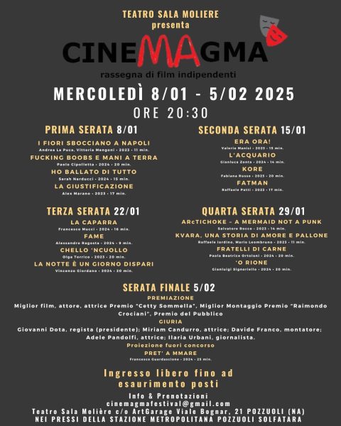 Si terrà dall’8 gennaio al 5 febbraio 2025, ogni mercoledì alle ore 20.30, nel teatro Sala Molière di Pozzuoli, diretto da Nando Paone (Via Bognar, 21, nei pressi della stazione metropolitana Pozzuoli/Solfatara), la V edizione di “Cinemagma”, la rassegna di film indipendenti selezionati dallo storico del cinema Giuseppe Borrone, ad ingresso libero. La kermesse nasce con lo scopo di offrire una vetrina ai talenti emergenti del cinema italiano, focalizzando l’attenzione sul formato breve del cortometraggio e sui film underground che, come richiamato nel titolo della rassegna, ispirato all’elemento naturale simbolo di Pozzuoli e di una terra vulcanica come i Campi Flegrei, scorrono sotto la superficie del cinema mainstream, premendo per arrivare a intercettare i loro potenziali destinatari.