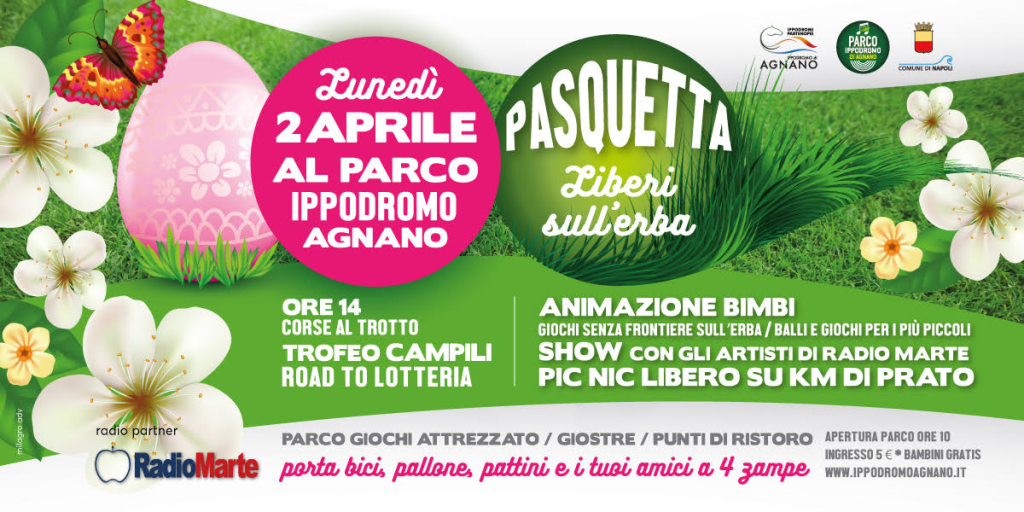 NAPOLI – Si rinnova come da tradizione, l’appuntamento di Pasquetta all’Ippodromo con Radio Marte e la banda marziana all’opera. Lunedì 2 aprile 2018, il parco di Agnano aprirà i cancelli dalle ore 09.00 con un ticket d’ingresso di soli 5 euro per gli adulti (ingresso bambini totalmente gratuito), comprensivo di accesso al giardino del parco e al cosiddetto “pratone”, la maxipista del galoppo aperta per l’occasione a pic-nic, giochi e tantissima musica live. Collegamenti in diretta su Radio Marte con Gaetano Gaudiero, Franco Simeri, Francesco Mastandrea, Marco Critelli ed il “Vip Party Live Show”, spettacolo di animazione e dj-set con Gigio Rosa e Gigi Soriani. Oltre a giochi per i più piccoli ed animazione a cura di Casper Animation, saranno aperti anche pizzeria e caffetteria del parco, entrambi con menù speciali a prezzi “family”, il parco giochi attrezzato, le giostre ed i jumping gonfiabili, le passeggiate sui pony ed i food corner in stile “street food”. Alle 14.00, le corse al trotto del Trofeo Campili. Ospiti sul palco marziano le cantanti Ilaria Cretaro, Vittoria Iannaccone e Milena Setola.