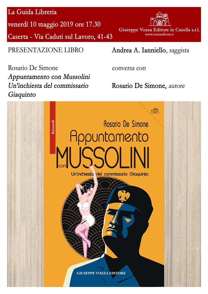 Venerdì 10 maggio 2019 alle ore 17.30 presso la Guida libreria di Caserta via caduti sul Lavoro 41-43 si terrà la presentazione del libro di Rosario De Simone “Appuntamento con Mussolini – Un’inchiesta del commissario Giaquinto”, ed .Giuseppe Vozza Editore in Casolla. L’autore Rosario De Simone dialogherà con Andrea Ianniello del suo ultimo lavoro.