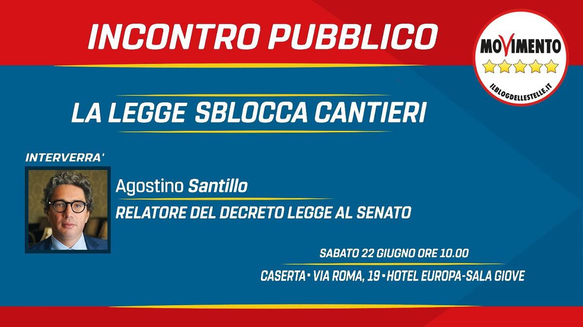 CASERTA – Sabato 22 giugno alle ore 10.00, presso l’Hotel Europa-Sala Giove in Via Roma, 19 a Caserta, il relatore del decreto Sblocca Cantieri Agostino Santillo terrà un incontro pubblico per spiegare tutti i contenuti di questa Legge molto articolata e su cui è stata fatta tanta disinformazione. Si parlerà del Codice degli Appalti, dei cantieri fermi in tutta Italia, di semplificazioni per le costruzioni private in zona sismica, delle misure per le zone terremotate, ma soprattutto si parlerà di legalità. L’incontro è aperto alla cittadinanza, professionisti e tecnici del settore pubblico e privato.