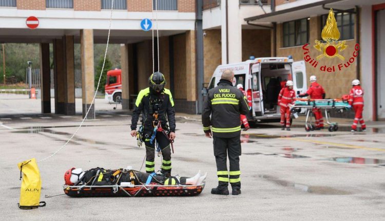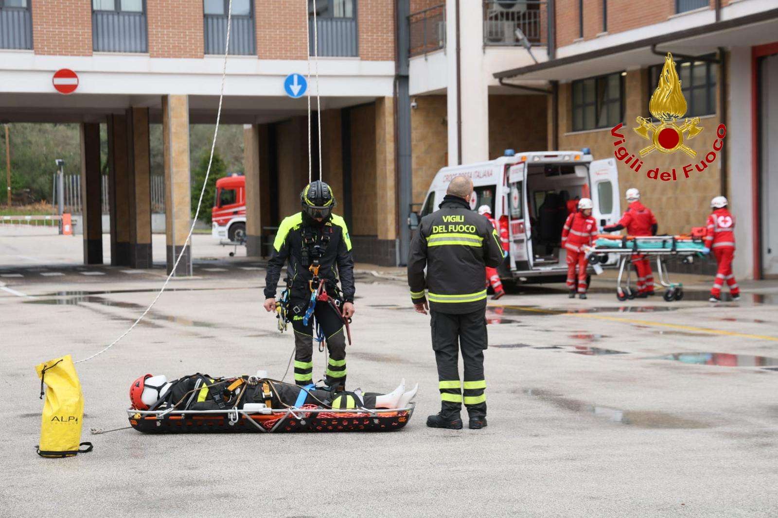 Successivamente, il secondo momento della mattinata si è incentrato sulla dimostrazione pratica di alcune manovre di soccorso da parte di alcuni nuclei specialistici del CNVVF: il nucleo SAF (Speleo-Alpino-Fluviale), che ha inscenato una manovra di soccorso in alta quota ad una persona che ha sofferto un malore, con successivo trasporto a terra e affidamento al personale della Croce Rossa Italiana, e il nucleo NBCR (Nucleare-Batteriologico-Chimico-Radiologico) che ha simulato uno scenario nel quale sono stati rilevati fusti pieni di sostanze radioattive, con la accurata descrizione di tutte le fasi operative della manovra: dalla ricerca delle sorgenti fino alla procedura di decontaminazione.