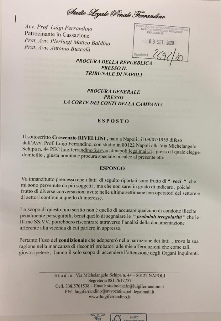 “Questo esposto è solo un’altra delle cose stranissime di cui il Governatore è protagonista – ha affermato Rivellini – L’impresa, che ha già lavorato con lui a Salerno, si è aggiudicata gli appalti dei porti turistici, nonostante in fase di bando abbia presentato un documento che andava rigettato, non conforme alle regole istruttorie. (Alleghiamo esposto).
