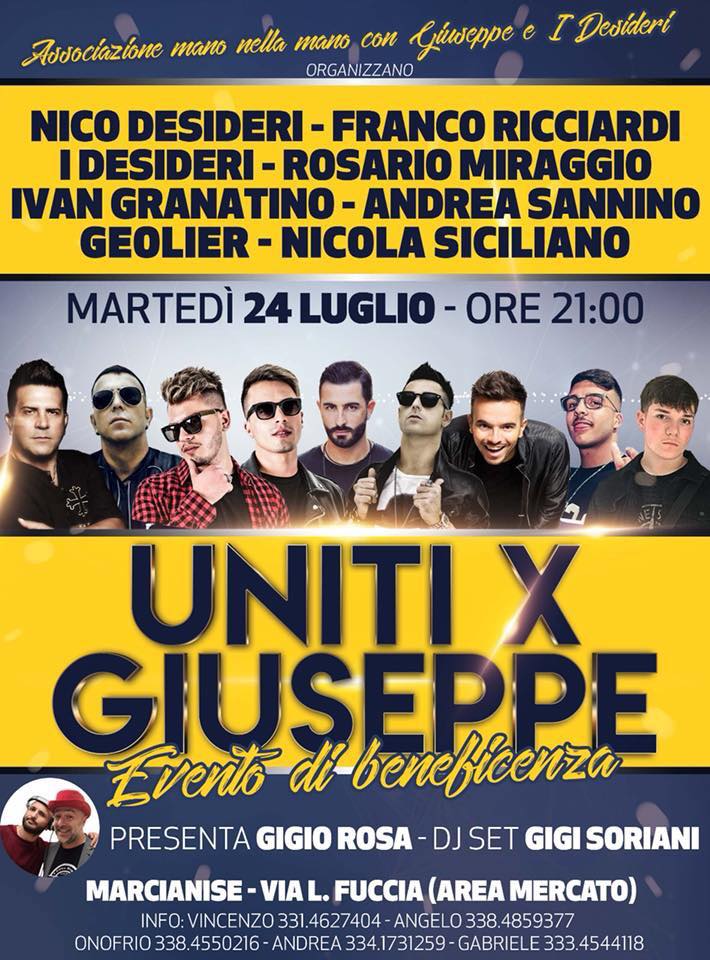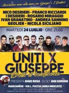 La serata è stata organizzata dall’Associazione Mano nella mano con Giuseppe e da I Desideri e importanti e tanti sono i nomi degli artisti che si avvicenderanno sul palco nel corso della serata: Nico Desideri, Franco Ricciardi, I Desideri, Rosario Miraggio, Ivan Granatino, Andrea Sannino, Geolier e Nicola Siciliano. Presenterà la serata Gigio Rosa e al termine di questa ci sarà il DJ set di Gigi Soriani.