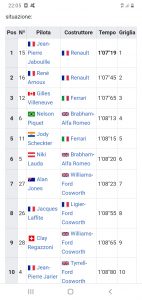 Ma andiamo con ordine o almeno ci proviamo. La prima fila è tutta targata Renault, che ,col nuovo motore aspirato turbo, è avanti col compagno di scuderia Arnoux, di appena 24 millesimi di secondo, (marca francese delle monoposto e prima fila tutta biancorosso e blu la bandiera della Francia)