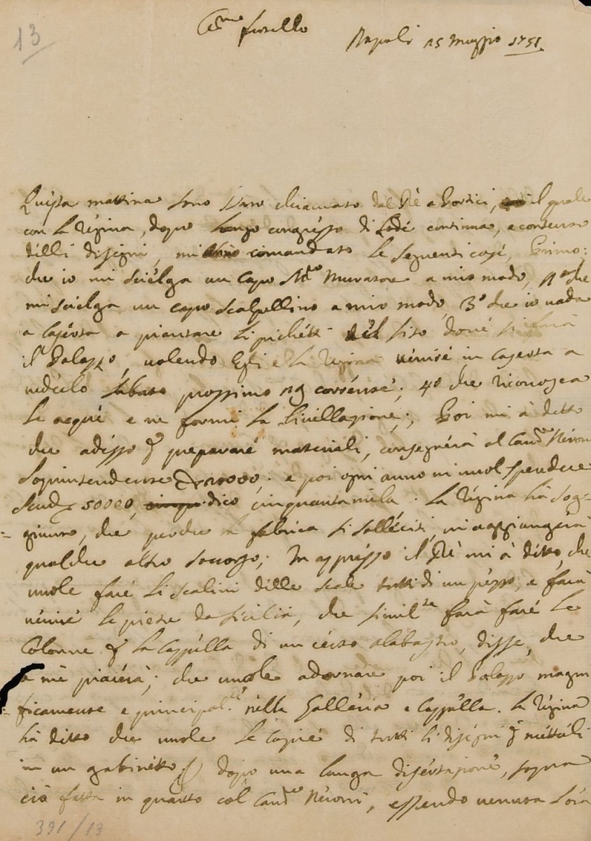 Tra i documenti digitalizzati anche la lettera del 25 maggio 1751 che segna l’inizio della storia della costruzione della Reggia di Caserta. Nella missiva, infatti, Vanvitelli racconta al fratello, abate della chiesa di San Giovanni dei Fiorentini a Roma, di doversi recare a Caserta, su ordine del re, per tracciare, con un capomastro e un capo scalpellino, il perimetro su cui poi verrà edificata la Reggia. Il re Carlo di Borbone presenta alla corte il progetto scelto, si congratula con il Vanvitelli e stanzia la cifra di 50.000 ducati l’anno per i lavori, fissando all’1 gennaio 1752 la cerimonia per la posa della prima pietra.