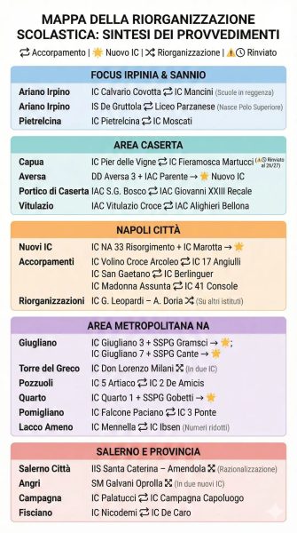 Lo scorso lunedì 29 dicembre se n’è discusso, a Palazzo Santa Lucia, comportando la protesta dei sindacati. In particolare, Ottavio De Luca, segretario generale della Flc-Cgil Napoli e Campania, e Nicola Ricci, segretario generale della Cgil Napoli e Campania, hanno fatto presente quanto sia fondamentale tutelare l’autonomia scolastica e la storia di ciascun istituto. Una contrarietà dimostrata mediante una lettera aperta indirizzata al Presidente della Regione, Roberto Fico, al direttore dell’Ufficio Scolastico Regionale e all’Anci. Nel piano di dimensionamento scolastico della Campania sono coinvolte le scuole di tutte le 5 province.