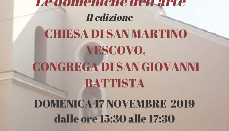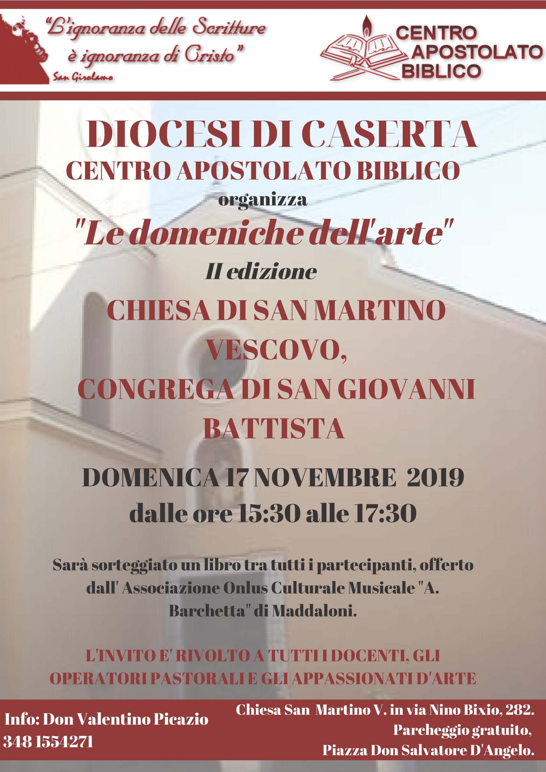 Il Centro Apostolato Biblico della Diocesi di Caserta, guidato da don Valentino Picazio, domenica prossima 17 novembre con inizio alle ore 15.30 e fino alle 17.30, avrà come meta storico culturale la chiesa di San Martino e la collegata Congrega di San Giovanni Battista come seconda importantissimo appuntamento de “Le domeniche dell’arte”.