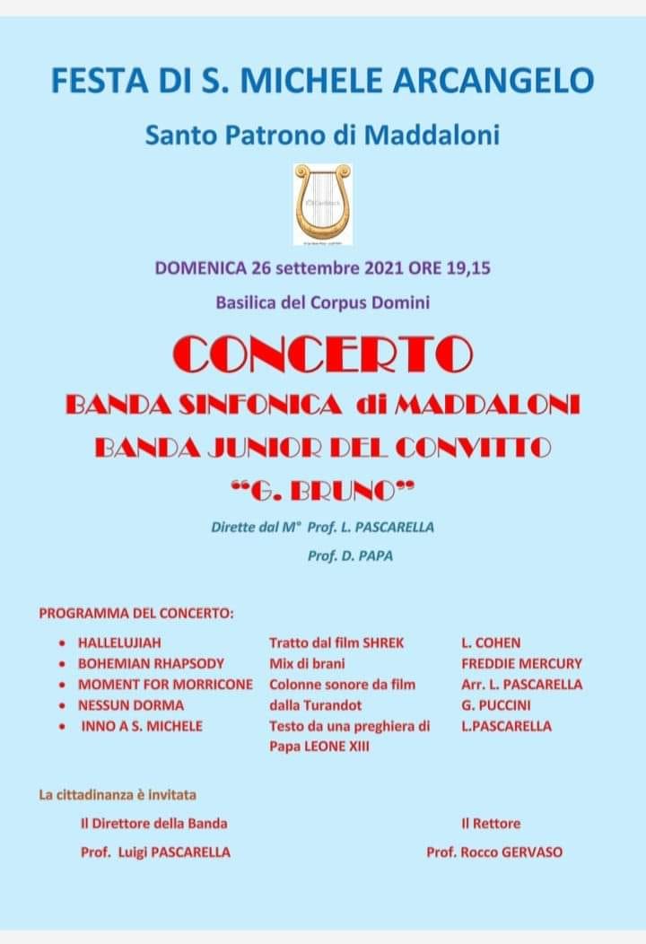 Trovandosi a vivere in onore del Santo Patrono una programmazione essenzialmente religiosa e nel senso più “stretto” possibile con tanto di assenza della processione cittadina, quello che per fortuna ritorna, ripristinato da qualche anno (ovvero dalla nascita della Banda Sinfonica della Città di Maddaloni), sarà il concerto bandistico in onore dell’arcangelo.