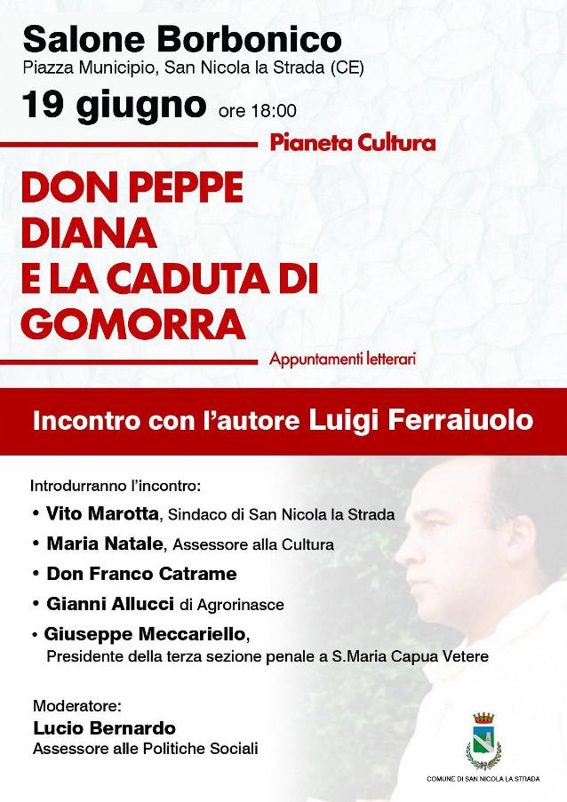 “Don Peppe Diana e la caduta di Gomorra” è il titolo del libro scritto dal giornalista Luigi Ferraiuolo che mercoledì 19 giugno 2019, alle ore 18,00, sarà presentato nel Salone borbonico in piazza Municipio a San Nicola la Strada. Interverranno con l’autore il giudice Giuseppe MECCARIELLO, Presidente della terza sezione penale del Tribunale di Santa Maria Capua Vetere, don Franco CATRAME, parroco di Santa Maria degli Angeli a san Nicola la Strada e Gianni ALLUCCI di Agrorinasce.