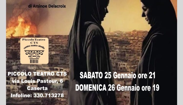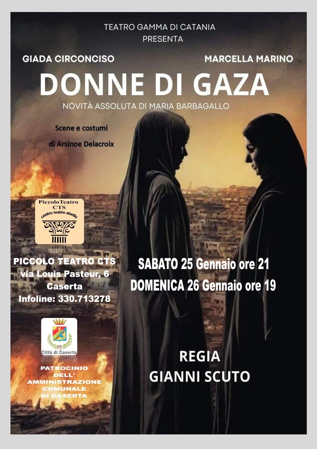 Dopo quello della settimana scorsa, arriva un altro interessante spettacolo al Piccolo Teatro Cts di Caserta, con questo dodicesimo appuntamento della 24/ esima stagione teatrale: arriva da Catania lo spettacolo DONNE DI GAZA di Maria Barbagallo per la regia di Gianni Scuto. In scena ci saranno Marcella Marino e Giada Circonciso. Lo spettacolo, come al solito è previsto sabato 25 gennaio alle ore 21 e domenica 26 gennaio alle ore 19. Capita di sentirsi troppo fragili, inadeguati ad affrontare un tema grande come la guerra. Ma la tensione rimane costante, sotterranea, come un basso continuo. Poi ecco che un’immagine si staglia nella nostra mente, e sappiamo che quella immagine diventerà il cuore del nostro testo. “Strani bagliori nel cielo/Donne di Gaza” è una fotografia, vista centinaia di volte, di una città addormentata, il cui cielo notturno è solcato da bombe. E da questa notte emergono due donne che vogliono parlare, che vogliono dire la loro. E noi non possiamo fare altro che ascoltarle, perché saranno loro a trovare le parole che noi non riuscivamo a dire. Dedicato a tutti noi, inermi contro la bestialità della guerra (Maria Barbagallo). Uno spettacolo che coinvolge una realtà terribile dei nostri giorni, una realtà di guerra, di mancanza di umanità e di una sorta di vera e propria “pulizia etnica”. La piéce, della durata di 70 minuti circa in un atto unico, è interpretata da due bravissime attrici siciliane che si impegnano in una recitazione serrata che ci riporta in pieno, grazie all’originale scrittura dell’autrice, nell’atmosfera tesa, irrazionale e terribile di Gaza con una guerra incomprensibile, feroce e senza tregua (Gianni Scuto).