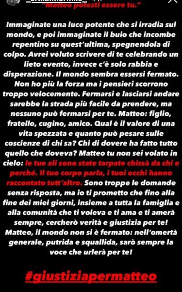 Lascia dubbi anche una frase poco chiara scritta qualche giorno prima di morire da Matteo su un TIKTOK. Era una frase scritta tanto per ? O aveva paura, era minacciato forse?