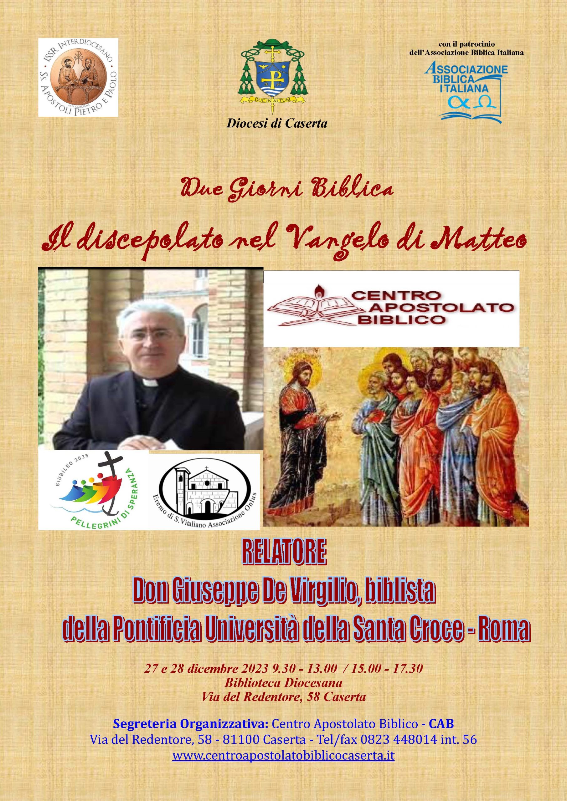 Come ogni anno si rinnova l’appuntamento con la Parola per il mese di dicembre con la Due Giorni Biblica organizzata dal Centro Apostolato Biblico diretto da don Valentino Picazio, con il patrocinio dell’ABI (Associazione Biblica Italiana) e l’ISSR Interdiocesano SS. Apostoli Pietro e Paolo. Tematica del nuovo appuntamento comunità e i discepoli nel Vangelo secondo Matteo che si svolgerà presso la biblioteca diocesana di Caserta nei giorni 27 e 28 dicembre con inizio alle ore 09.30. Relatore all’annuale appuntamento il biblista don Giuseppe De Virgilio docente di Esegesi del Nuovo Testamento presso la Pontificia Università della Santa Croce di Roma, che ormai a Caserta possiamo affermare che “è di casa” essendo da diverse edizioni relatore dell’importante avvenimento culturale. La lettura del Vangelo di Matteo costituisce per la Chiesa una grande opportunità di formazione al discepolato, per una sempre nuova comprensione di se stessa. Similmente agli altri due vangeli sinottici e a differenza del Vangelo sec ondo Giovanni, in Matteo Gesù parla del Regno dei Cieli che di se stesso, e insegna principalmente attraverso brevi parabole o detti piuttosto che con lunghi discorsi.