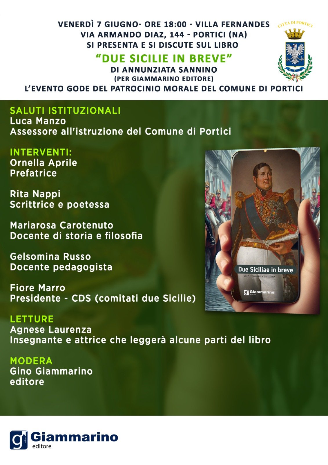 Dopo i saluti istituzionali dell’Assessore al Comune di Portici, Luca Manzo, e moderati dall’ editore Gino Giammarino, interverranno, con l’autrice Nunzia Sannino, la prefatrice – prof. di letteratura Storia moderna della Federico II, Ornella Aprile, la scrittrisce e poetessa Rita Nappi, la docente di storia e filosofia Maria Rosaria Carotenuto, la docente pedagogista Gelsomina Russo e Fiore Marro, la Presidente CDS (Comitati Due Sicilie).