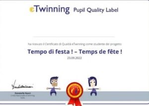 Il progetto europeo “È tempo di festa” -a cui l’IC ha partecipato- ha visto i discenti delle classi II e III A, coadiuvati dalla prof.ssa Maria Grazia Rapuano, impegnati in attività di comunicazioni in lingua francese con partner di madrelingua. Gli allievi si sono cimentati in alcune attività (presentazioni personali, scambi di auguri natalizi, produzione di maschere di Carnevale in carta riciclata), per poi confrontarsi sulle ricette dei piatti tipici. Attività diverse, ma tutte unite dallo scopo di creare un ponte virtuale Italia-Francia e proiettare così i giovani allievi in una dimensione europea.