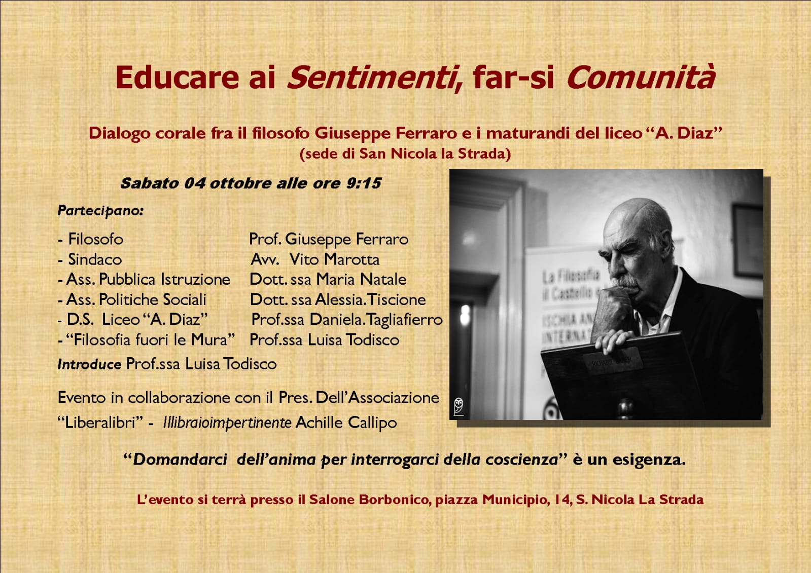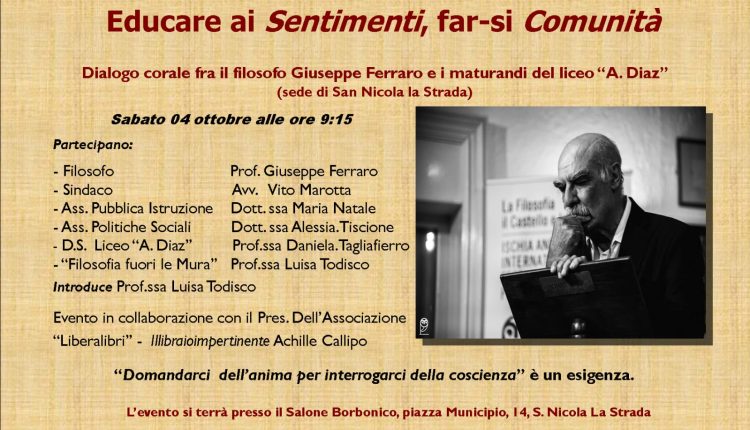 Un incontro per riflettere sul valore dei sentimenti e sul senso di comunità: sabato 4 ottobre, alle ore 9:15, il Salone Borbonico di San Nicola la Strada ospiterà il dialogo corale Educare ai Sentimenti, far-si Comunità, con il filosofo Prof. Giuseppe Ferraro, che dialogherà con gli studenti maturandi del Liceo “A. Diaz” (sede di San Nicola la Strada).