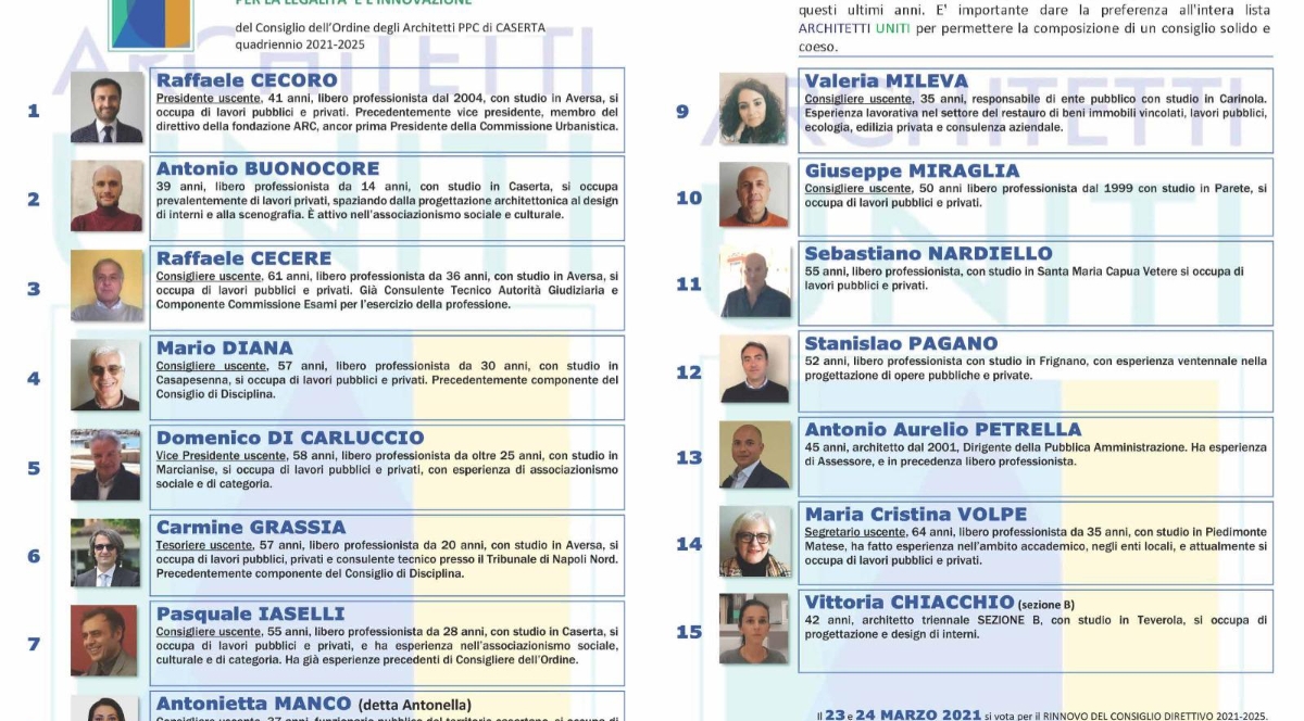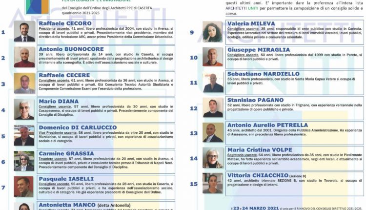 Straordinaria affermazione della lista “Architetti Uniti” per la legalità e l’innovazione, alle elezioni per il rinnovo del Consiglio dell’Ordine degli Architetti PPC della provincia di Caserta, svoltesi per via telematica, tramite la piattaforma ‘Vota Facile’, nelle giornate di ieri e dell’altro ieri.
