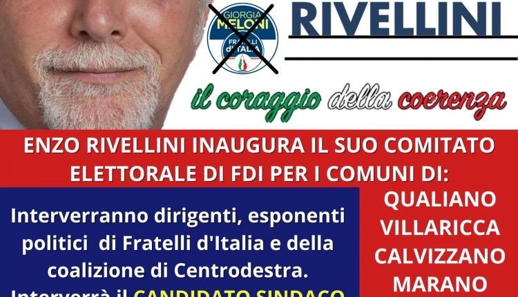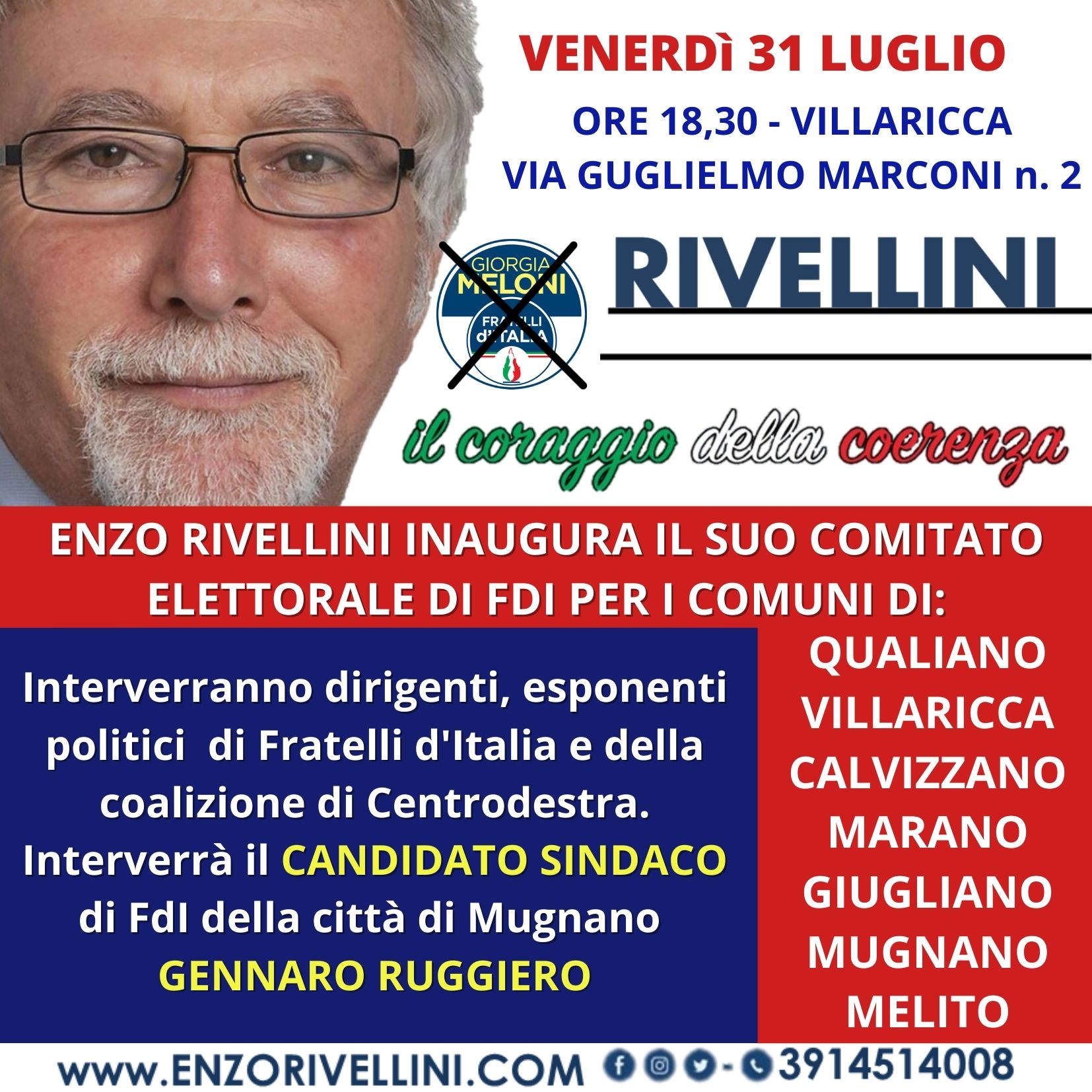 Oggi, venerdì 31 luglio, Rivellini inaugurerà il proprio comitato elettorale, per Fratelli d’Italia, a Villaricca (NA), ore 18,00 in via Guglielmo Marconi 2.