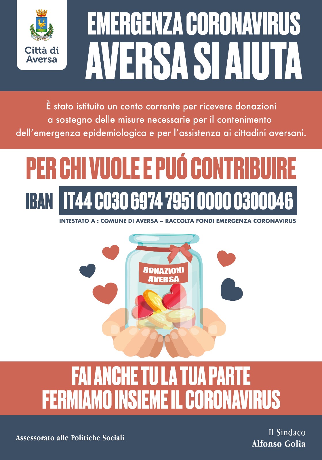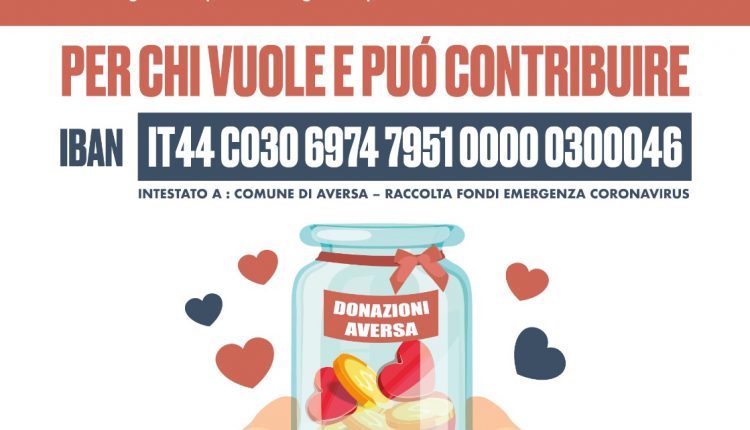 Oggi parte la campagna “Aversa si aiuta”. Abbiamo istituito un conto corrente per donazioni che permetteranno di attuare ogni misura di contenimento necessaria dell’emergenza epidemiologica e di assistenza alla popolazione.