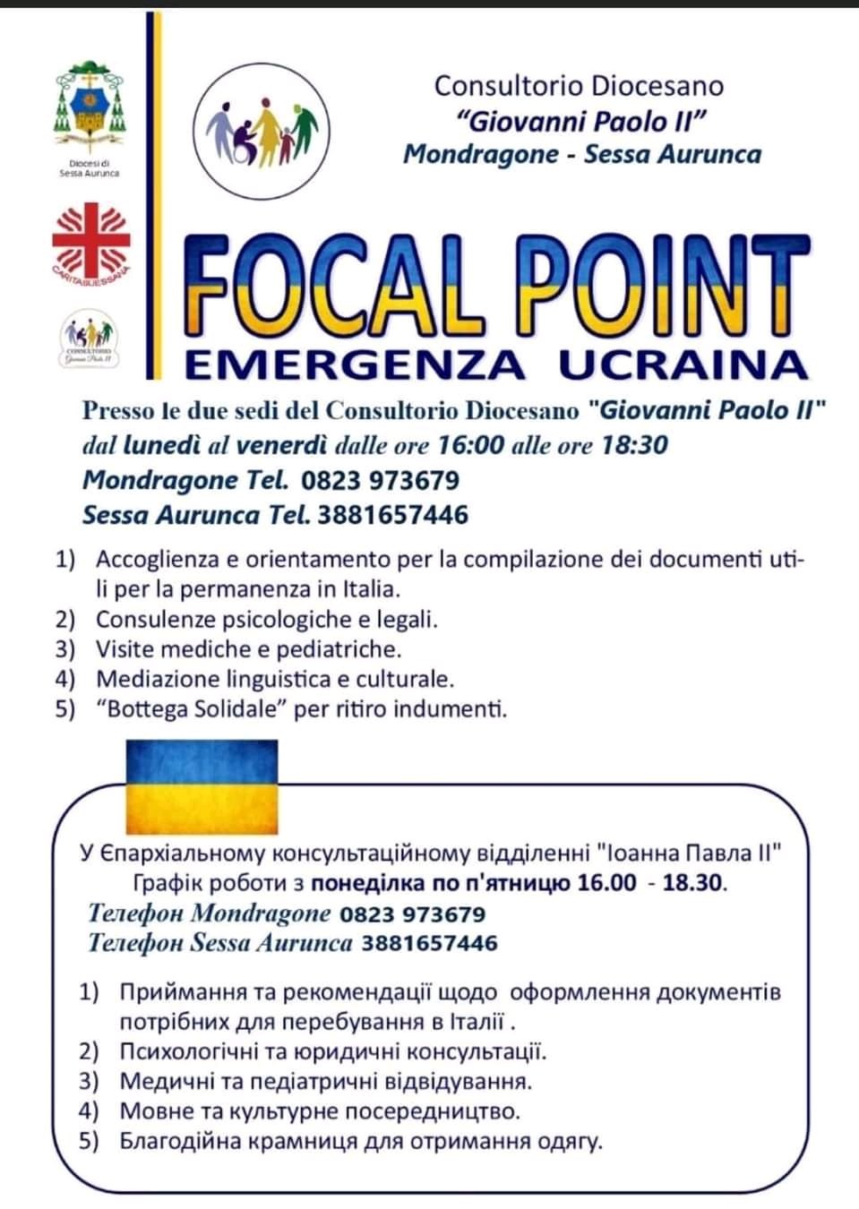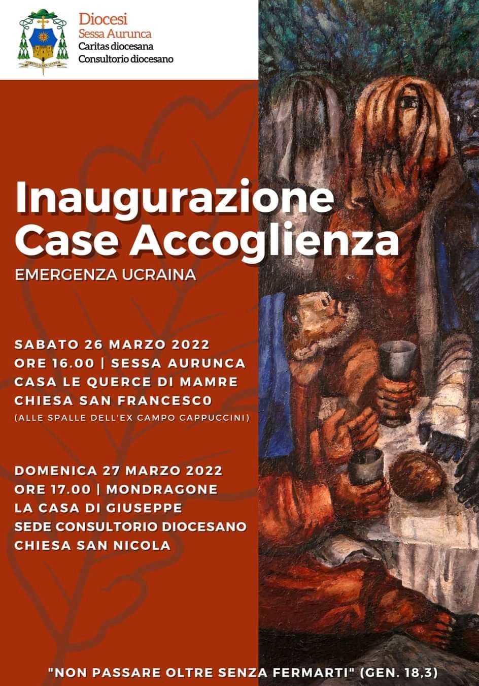 Sarà, pertanto, inaugurata dal Vescovo di Sessa Aurunca, Monsignor Orazio Francesco Piazza, sabato 26 marzo, alle ore 16:00, la casa “Le Querce di Mamre”, un complesso di appartamenti adiacenti la Chiesa di San Francesco a Sessa Aurunca e sede del Focal Point allestito per la Forania di Sessa Aurunca e Cellole. Accoglienza e orientamento nella compilazione di documenti utili alla permanenza in Italia, consulenze psicologiche e legali, visite mediche e pediatriche, mediazione linguistica e culturale sono i servizi disponibili presso i Focal Point che, allestiti anche a Mondragone, vedono la compresenza di una “Bottega Solidale” per il ritiro degli indumenti.