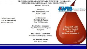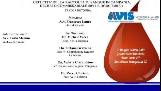 Tale notizia, dovuta, è scaturita da una precedente missiva inviata fagli “avisini”: Rosario Laudato Massimiliano Di Deco che hanno portato a conoscenza e denunciato una incresciosa situazione venutasi a creare a Caserta: “Al Presidente della Regione Campania On. Vincenzo De Luca, Al Presidente della Commissione Sanità della Regione Campania On. Stefano Graziano, Al Sindaco del Comune di Caserta Avv. Carlo Marino, al Presidente Regionale Avis Campania Cav. Di Martino, al Presidente Avis Nazionale Dott. Briola, alla Redazione “Striscia la Notizia”: Egregi tutti, scopriamo che il giorno 07.05.2019 c/o il Gran Hotel Vanvitelli (sito in San Marco Evangelista) verrà organizzato un convegno dall’AVIS Comunale di Caserta, al cui tavolo sono stati invitati dei rappresentanti civili e politici, per discutere della criticità della raccolta sangue e vari decreti.