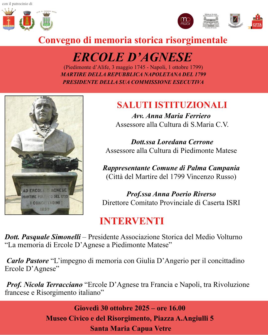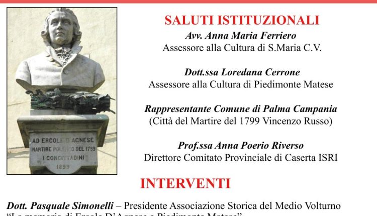 Seguiranno gli interventi del dottor Pasquale Simonelli, Presidente Associazione Storica del Medio Volturno con “La memoria di Ercole D’Agnese a Piedionte Matese“; Carlo Pastore con “L’impegno di memoria con Giulia D’Angerio per il concittadino ercole D’Agnese” e il professor Nicola Terracciano con “Ercole D’Agnese tra Francia e Napoli, tra Rivoluzione francese e Risorgimento italiano“.