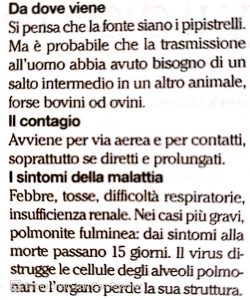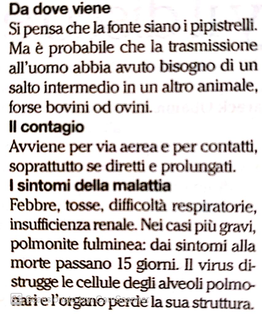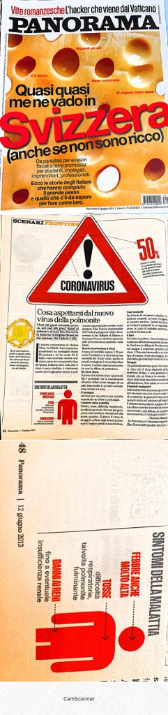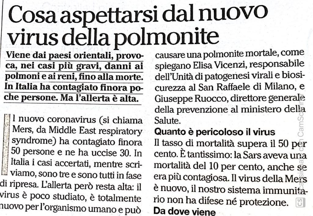 In questo articolo vogliamo semplicemente mostrare come, già nel giugno 2013, un autorevole settimanale italiano, Panorama, riporti nel n. 25 anno LI uscito il 12 giugno 2013 a pag. 48 l’intervista di Daniela Mattalia alla dott.ssa Elisa Vicenzi dell’ospedale San Raffaele di Milano, riconosciuta oggi come una delle maggiori virologhe italiane esperta proprio di SARS, un’intervista dal titolo: “Cosa aspettarsi dal nuovo virus della polmonite”