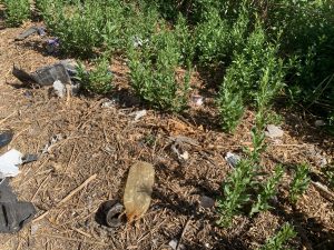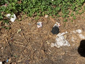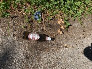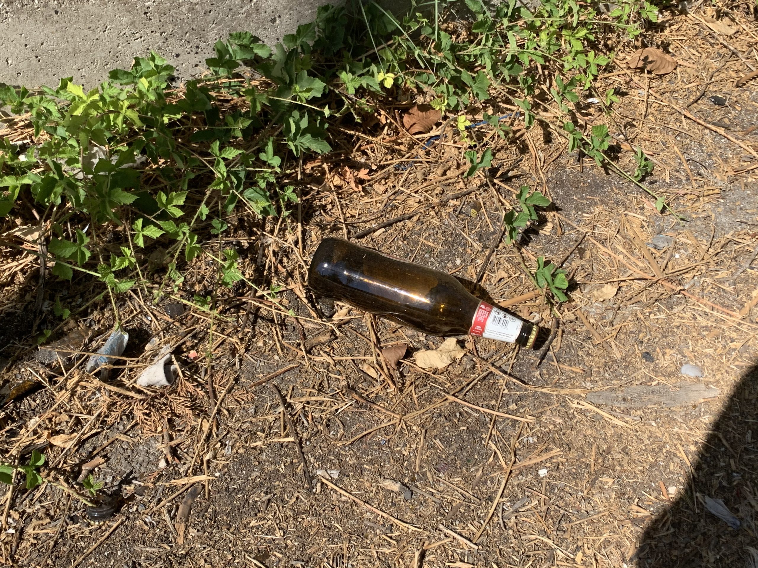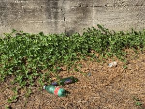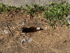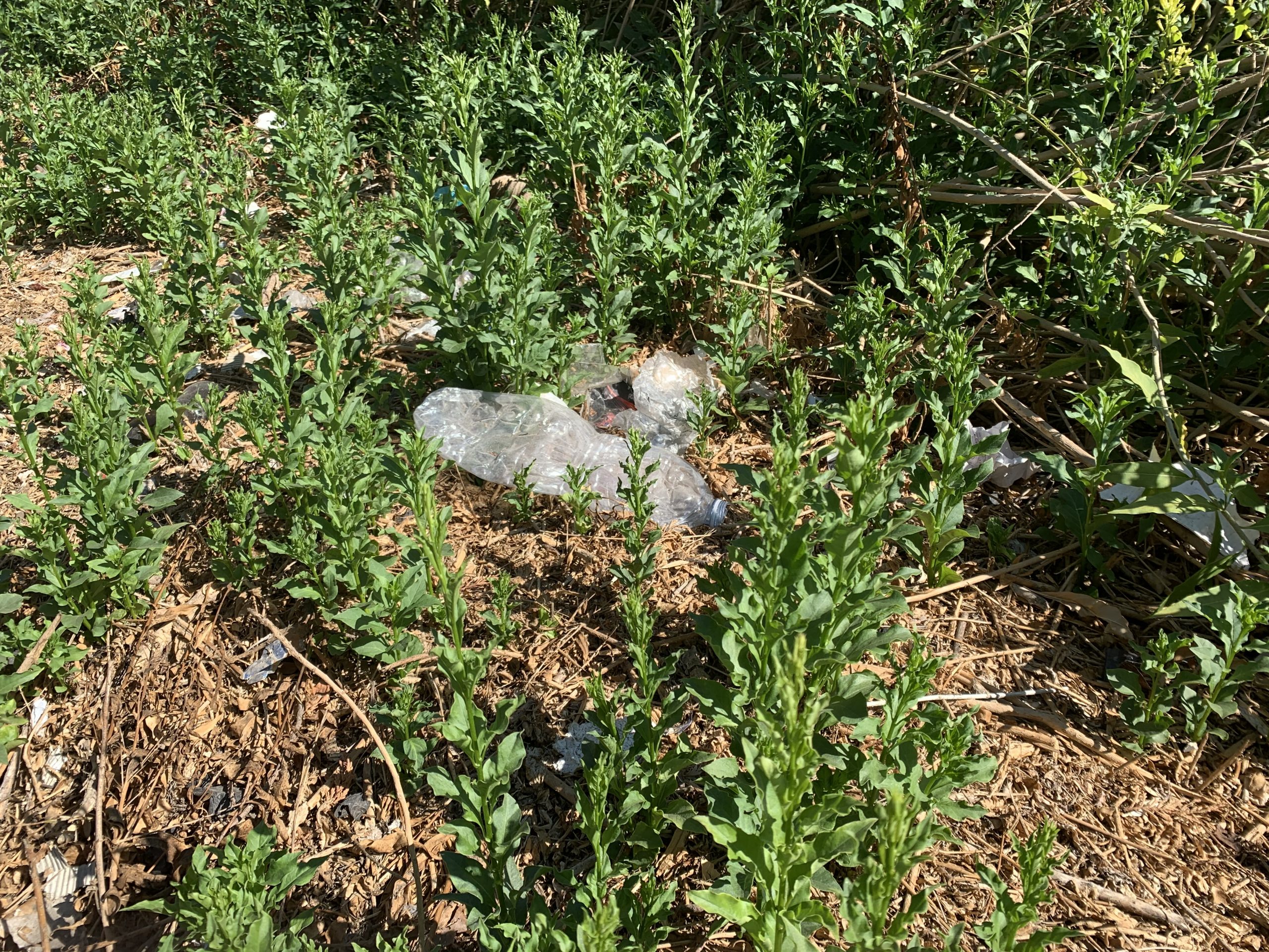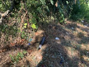 Per la problematica rifiuti le foto parlano da sole. Bottiglie e ed altri resti testimoniano presenze notturni di bivacchi e altri intrattenimenti poco leciti. Poco più avanti incontriamo un albero spezzato, che è stato staccato dal tronco e giace tra i rifiuti. Da mesi.