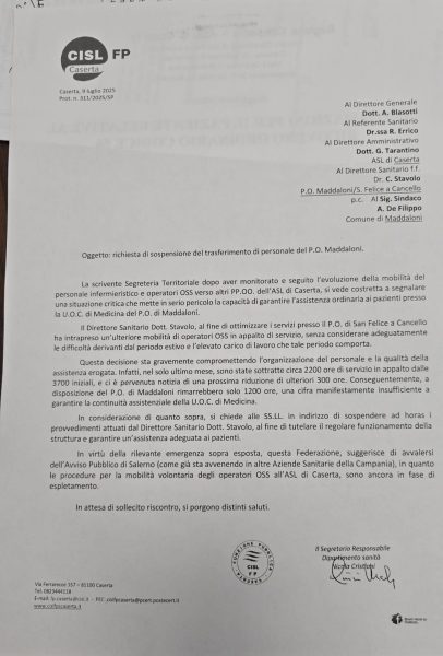 Maddaloni – Insorgono i sindacati e la CISL FP ha già mandato una richiesta di sospensione dei trasferimenti agli enti superiori, in particolare alla direzione sanitaria e alla direzione generale. Causa lavori, molti reparti ed ambulatori, come è noto, sono stati dislocati perssoil presidio ospedaliero “Ave Gratia Plena” di San Felice a Cancello. Complice anche la recente apertura del nuovo reparto di cardiologia riabilitativa, si è ravvisata la necessità di ulteriore personale sanitario in questa struttura.