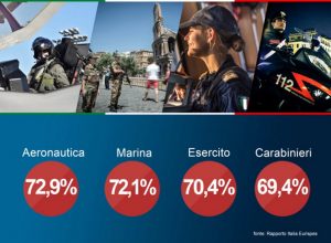 Secondo i dati dell’indagine condotta dall’istituto di studi politici, economici e sociale, le Forze Armate “continuano ad essere amate nel nostro Paese” e si tengono salde su posizioni di “fiducia consolidata” attestate al 72% circa. 7 italiani su 10 dimostrano l’apprezzamento per l’impegno profuso a sostegno della salvaguardia del territorio e della collettività nazionale ed internazionale, e confermano la fiducia degli italiani nei confronti dei militari.