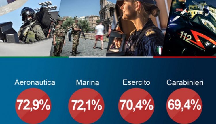 Le Forze Armate “continuano ad essere amate nel nostro Paese” e si tengono salde su posizioni di “fiducia consolidata” attestate al 72% circa. 7 italiani su 10 dimostrano l’apprezzamento per l’impegno profuso a sostegno della salvaguardia del territorio e della collettività nazionale ed internazionale