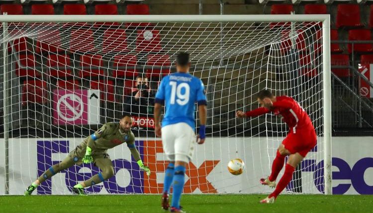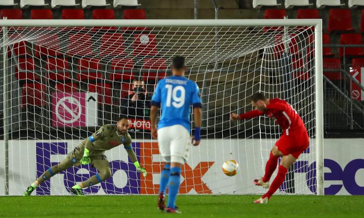 Il Napoli accusa il colpo, Bakayoko commette un fallo in area rigore per i biancorossi olandesi, Koopmainer però si lascia ipnotizzare da Ospina che con un guizzo felino devia la sfera sul palo e compie il miracolo.