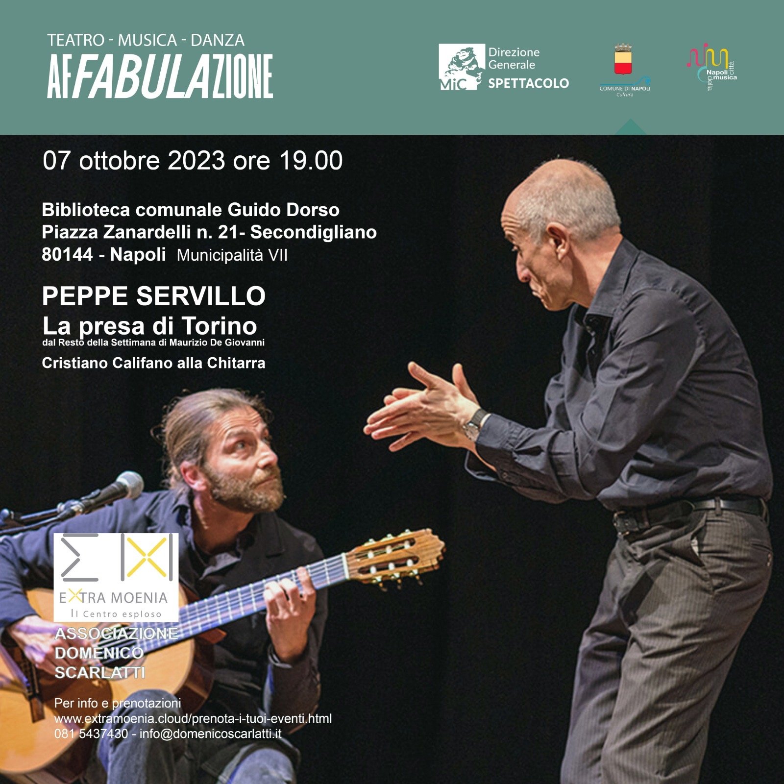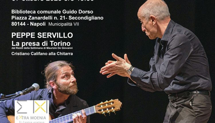 Prosegue “Extra Moenia – Il centro esploso” II edizione, la rassegna di spettacoli e concerti gratuiti nella VII Municipalità di Napoli a cura dell’associazione Domenico Scarlatti. In scena, sabato 7 ottobre 2023 alle ore 19 nella Biblioteca Guido D’Orso in Piazza Zanardelli, 21 a Secondigliano “La presa di Torino” protagonista Peppe Servillo con Cristiano Califano alla chitarra (ingresso gratuito). Il testo, tratto da un racconto di Maurizio De Giovanni che fa parte del libro “Il resto della settimana”, narra le vicende di quattro amici che nell’86, con una macchina improvvisata, partono da Napoli direzione Torino per assistere alla partita contro la Juve che culminerà con la conquista dello scudetto e la famosa scalata ai vertici del Napoli di Maradona. Una pièce che alterna narrazione e canzone.