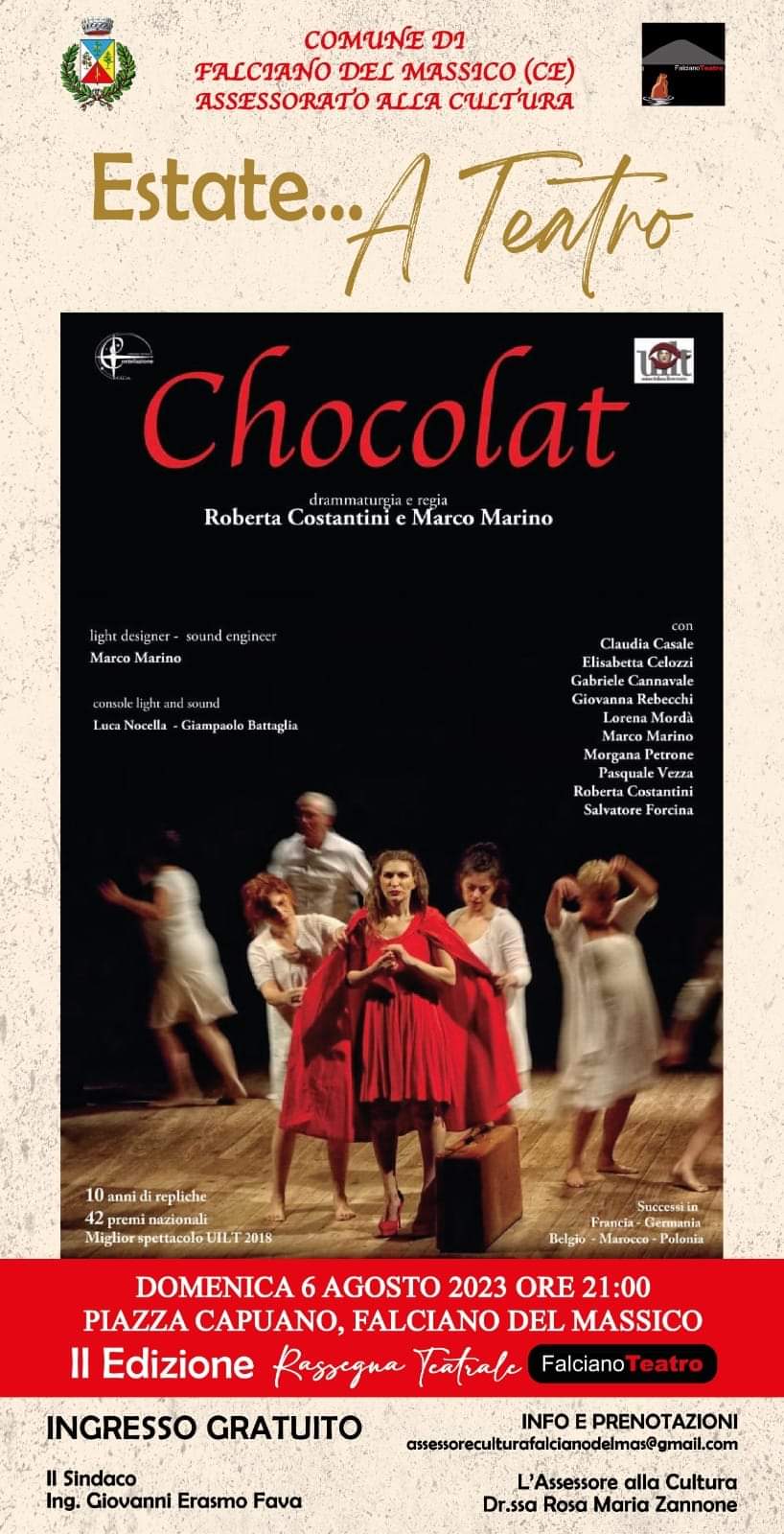 Il Comune di Falciano del Massico (CE), con l’Assessorato alla Cultura -coordinato dalla Dr.ssa Rosa Maria Zannone- è pertanto lieto di darvi appuntamento domenica, 6 agosto, alle ore 21, in piazza Capuano, per assistere alla nuova pièce in programma “Chocolat”, della Compagnia “Costellazione” di Formia (LT), testo, drammaturgia e regia a cura di Roberta Costantini e Marco Marino- una commedia peccaminosamente deliziosa! È liberamente ispirata a ‘Chocolat’ di Joanne Harris e all’omonimo film di L. Hallström Premio ‘Sele d’Oro del Mezzogiorno’ 2016 per il Teatro Contemporaneo.