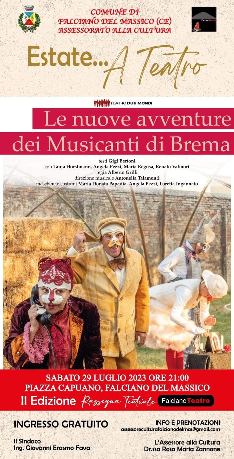 Falciano del Massico. Con “Le nuove avventure dei Musicanti di Brema” del Teatro Due Mondi, riallestimento che fa capo allo storico gruppo faentino della celebre fiaba dei Fratelli Grimm, si ripropone il ciclo di appuntamenti nell’ambito della rassegna teatrale “FalcianoTeatro”.