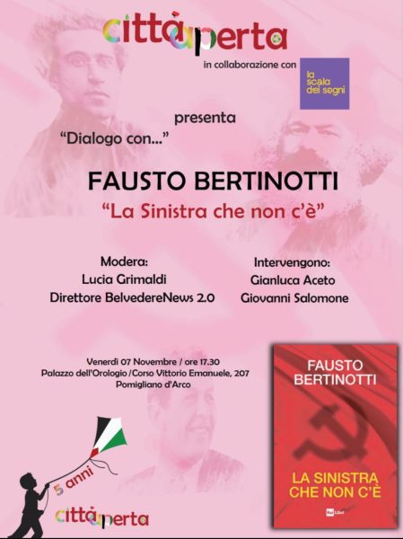 Venerdì 7 novembre alle ore 17:30, presso il Palazzo dell’Orologio di Pomigliano d’Arco, l’Associazione “Città Aperta” presenta un incontro pubblico con Fausto Bertinotti che presenta il suo ultimo libro “La sinistra che non c’è” , edito da Rai Libri. L’evento, moderato dalla giornalista Lucia Grimaldi, direttore di BelvedereNews 2.0, vedrà gli interventi di Gianluca Aceto e Giovanni Salomone, e si inserisce nel ciclo “Dialogo con…”, in collaborazione con La Scala dei Sogni. Nel libro, Bertinotti non si limita a tracciare un bilancio amaro: propone una lettura profonda e radicale della sconfitta della sinistra, in Italia e in Europa. Dalla sconfitta operaia alla Fiat nel 1980 alla caduta del Muro di Berlino, dalla subordinazione della politica alla finanza fino all’accettazione della guerra come strumento legittimo, l’autore denuncia una lunga catena di rinunce e compromessi che hanno reso la sinistra irrilevante. Ma La sinistra che non c’è non è solo un atto d’accusa: è anche un appello.