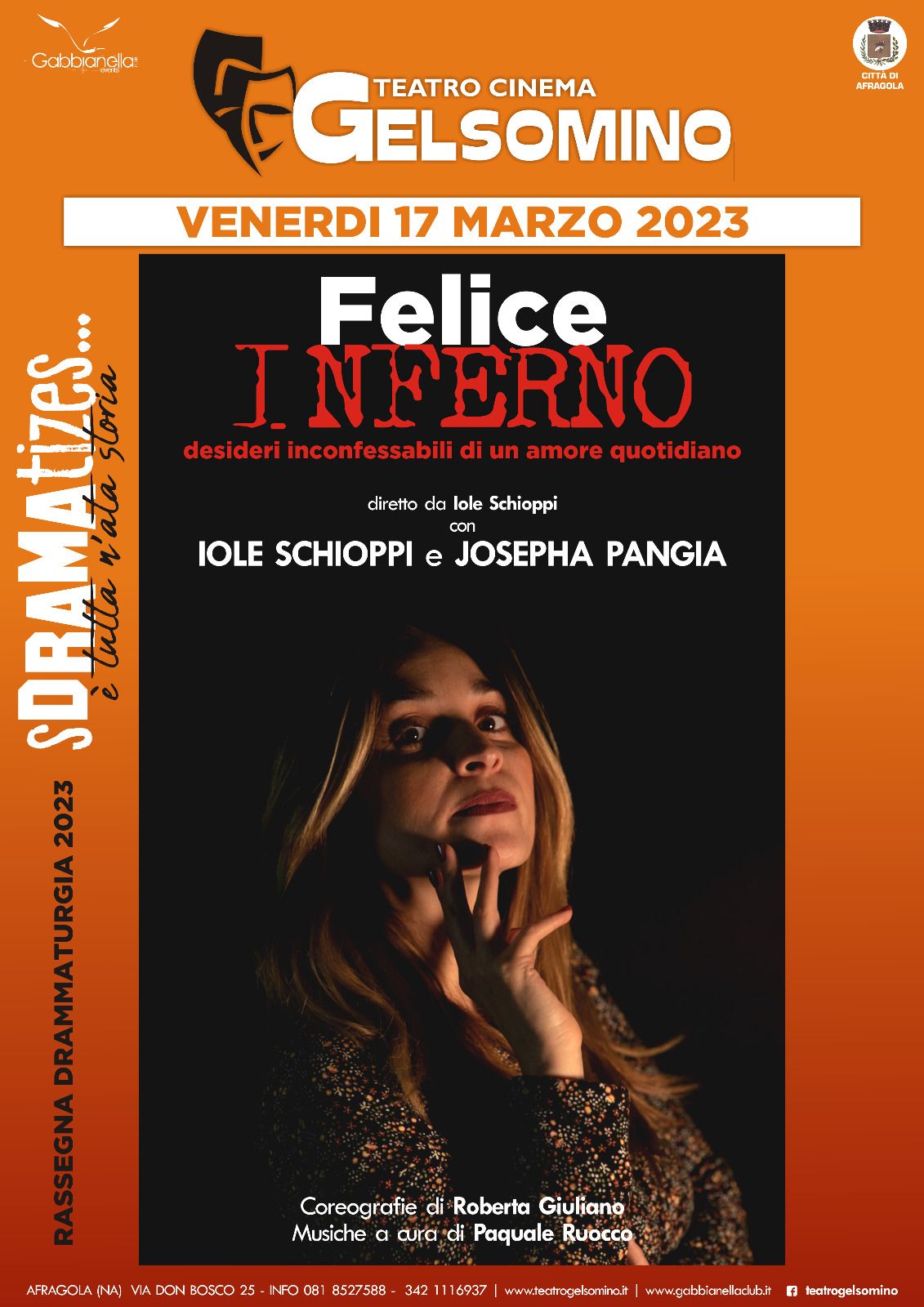 Il 17 Marzo 2023 alle ore 21:00 sarà rappresentato presso il Teatro Gelsomino di Afragola “Felice Inferno”, diretto da Iole Schioppi con Iole Schioppi e Josepha Pangia, coreografie di Roberta Giuliano, musiche di Pasquale Ruocco. Lo spettacolo Rientra nella rassegna di drammaturgia “sDRAMAtizes, è tutta n’ata storia”