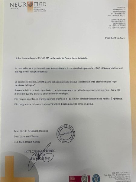 A causa delle gravissime condizioni in cui versava per il trauma cranico, dopo essere stata colpita dal padre, Antonia era stata trasferita dal Cardarelli di Campobasso al Neuromed di Pozzilli, in provincia di Isernia, ed era stata operata,  mostrando, il 20 Ottobre, i primi segnali di risveglio.