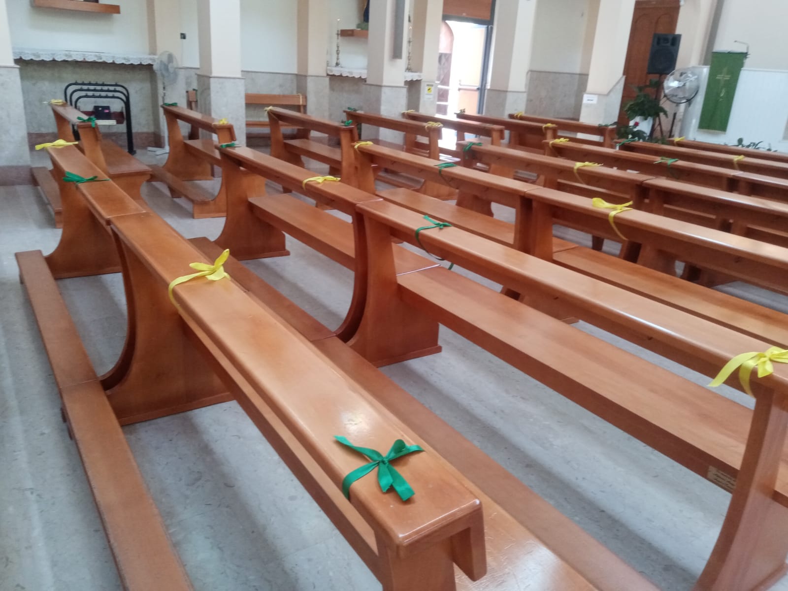 Noi di Belvederenews ci siamo recati sul posto avendo modo di osservare i preparativi: le panche del santuario nella giornata di oggi 1 Luglio sono state infatti allestite con nastrini gialli e verdi dai volontari del Comitato.