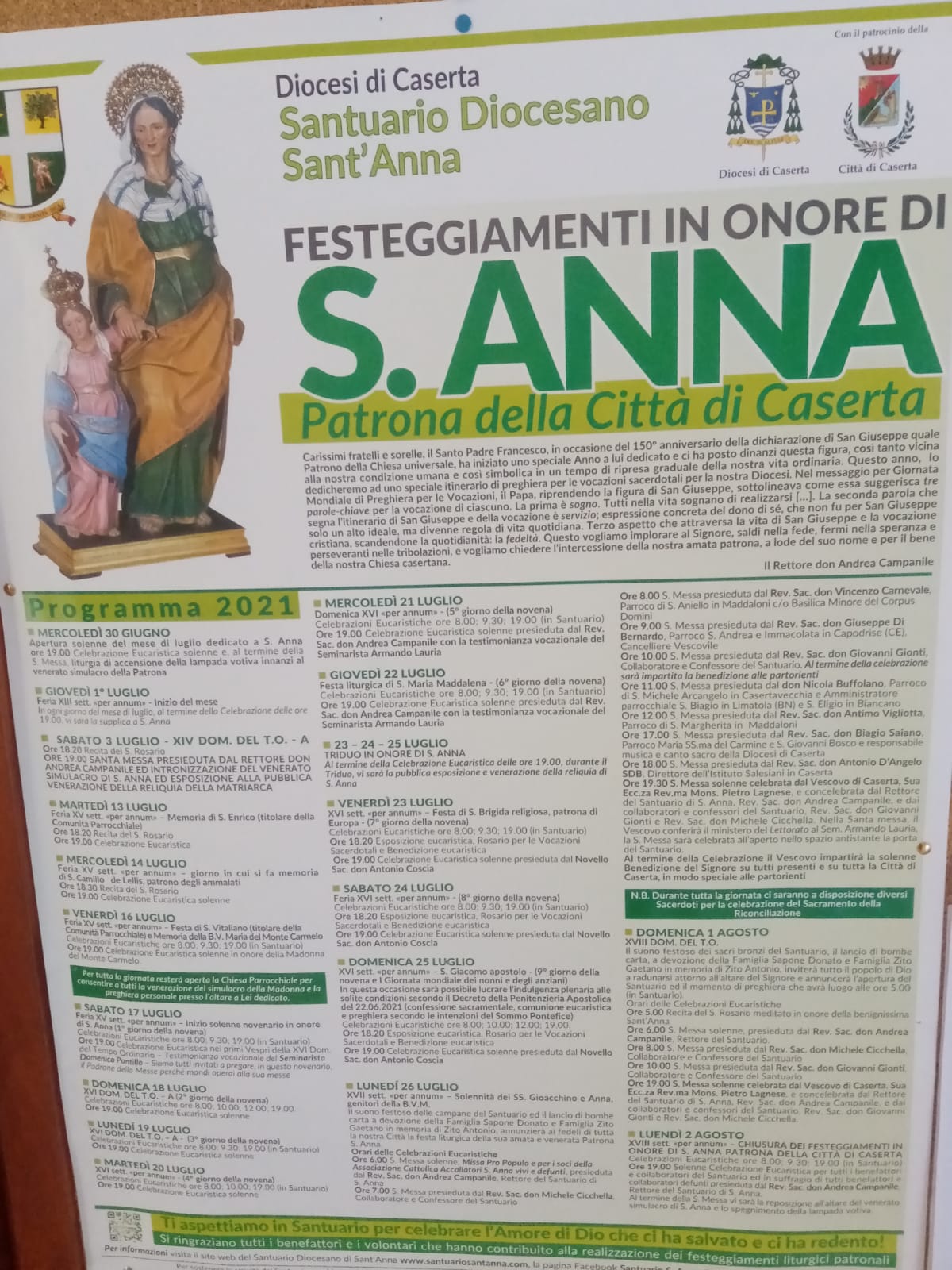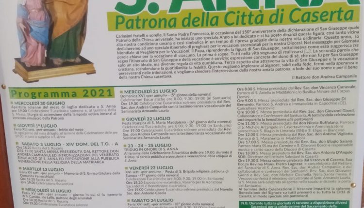 Si ricorda l’appuntamento alle 19 30 per la messa solenne celebrata dal Vescovo di Caserta sua eccellenza rev. Ma mons. Pietro Lagnese e concelebrata dal Rettore del Santuario di Sant’Anna rev sac Don Andrea Campanile e dai collaboratori del Santuario Reverendo Sacerdote Don Giovanni Gionti e Rev. SAC. DON Michele Cicchella.