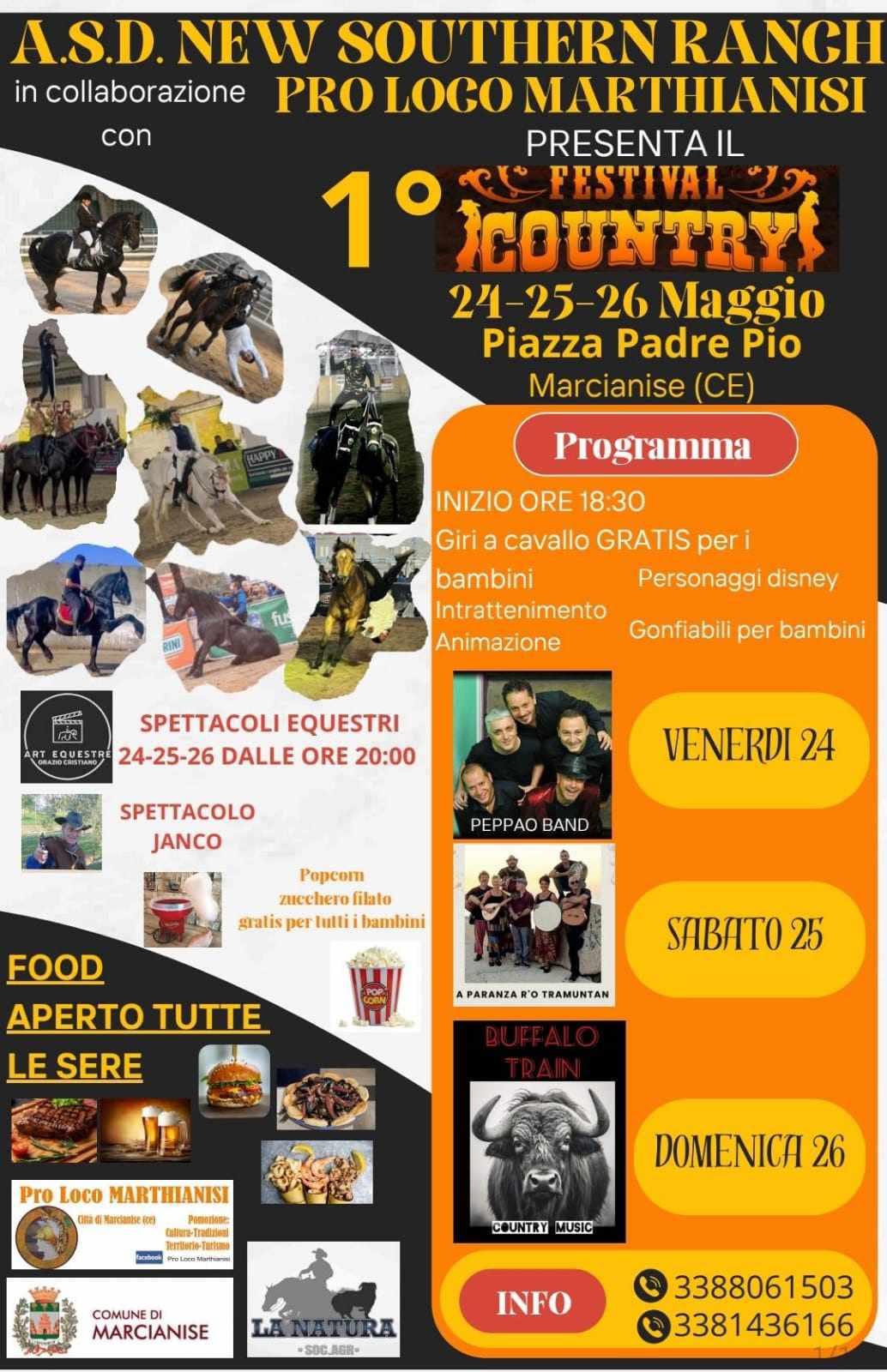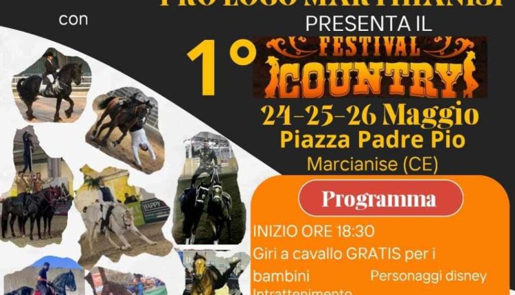 Inizia venerdi 24 e andrà avanti fino a domenica 25 il primo Festival Country a Marcianise. La manifestazione si terrà in Piazza Padre Pio ed è organizzata da A.S.D. New Southern Ranch in collaborazione con la Pro Loco Marthianisi. Durante le serate si alterneranno momenti di animazione per grandi e piccini. Giri a cavallo gratis, personaggi disney, animazione e gonfiabili e per i bambini Popcorn zucchero filato gratis. Tutte le sere musica dal vivo, la prima serata verrà animata dalla Peppao Band a seguire sabato 25 A Paranz’ ro Tramuntan’ e domenica 26musica country con i Buffalo Train. Inoltre spettacoli equestri con cavalli Frisoni e scena da fare west nello spettacolo Jango, nonché una ricca area Food. Divertimento assicurato. Per info: 3388061503 – 3381436166.