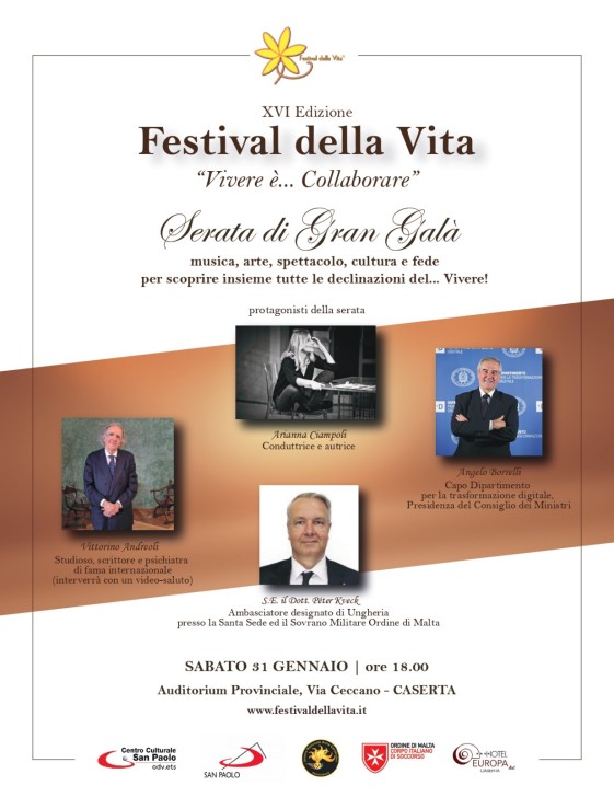 Come sempre, il Gran Galà si terrà sabato 31 gennaio alle ore 18:00 presso l’auditorium provinciale di Caserta, dove interverranno tra i tanti ospiti della serata il S.E. il Dott. Péter Kveck, ambasciatore designato di Ungheria presso la Santa Sede, il dott. Angelo Borrelli Capo Dipartimento per la Transizione Digitale della Presidenza del Consiglio dei Ministri, il salotto per la Vita accoglierà Chiara Pelizzoni ed Arianna Ciampoli, la conduzione è affidata a Gaetano Maschio ed a Maria Beatrice Crisci.