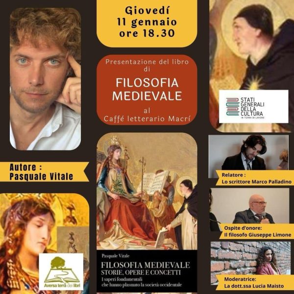 Il giorno 11 gennaio alle ore 18:30 presso il Caffè letterario Macrì ( sito in piazza Giuseppe Macrì, Sant’Arpino) sarà presentato il volume Filosofia medievale. Storie, opere e concetti, Diarkos editore. Sarà presente l’autore, il dott. Marco Palladino, il filosofo Giuseppe Limone e la dott.ssa Lucia Maisto. Al Macrì si parlerà di filosofia medievale, della sua importanza per il percorso formativo dei giovani liceali e non, del rapporto tra Oriente ed Occidente, di alcuni autori che purtroppo sono ignoti ai più e di alcune piccole novità presenti nel testo edito da Diarkos.