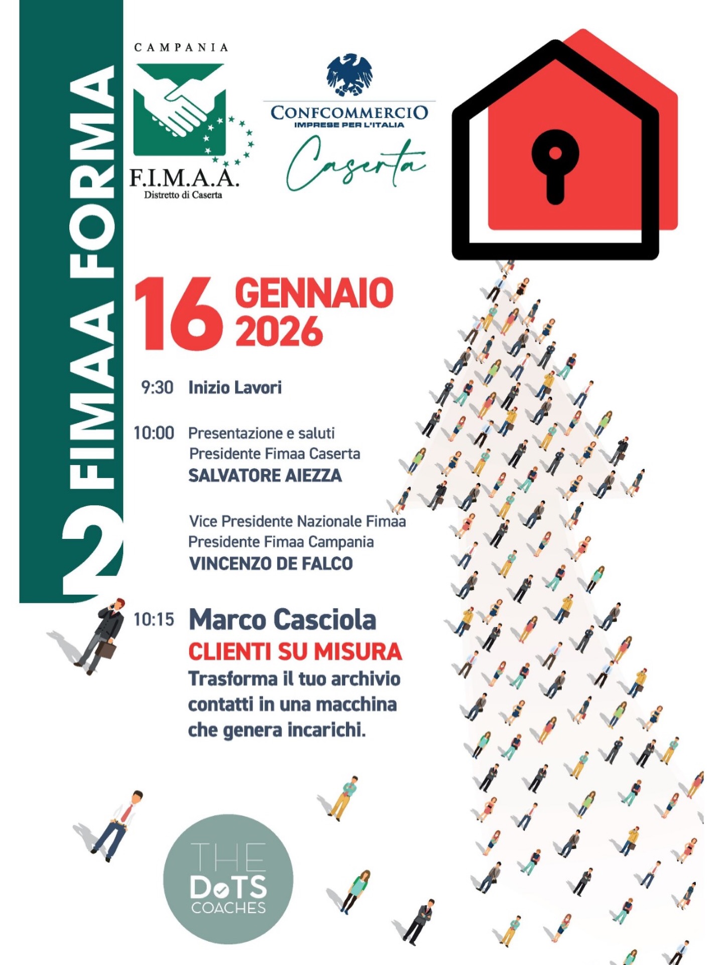 Il database marketing al centro del nuovo incontro formativo promosso da Fimaa Forma e Confcommercio Caserta. Il corso, in programma venerdì 16 gennaio, con inizio alle ore 9,30 nella sede di via Renella, avrà come relatore Marco Casciola, Business Coach Immobiliare. “Clienti su misura – Trasforma il tuo archivio contatti in una macchina che genera incarichi”, questo il titolo del seminario pensato per gli agenti immobiliari che vogliono strutturare meglio database, relazioni e opportunità di vendita. Il corso insegna infatti come organizzare, segmentare e attivare il proprio database per produrre appuntamenti, incarichi e referral in modo costante. Un metodo semplice, concreto e subito applicabile. L’incontro si aprirà con i saluti istituzionali del vice presidente nazionale e presidente regionale Fimaa, Vincenzo De Falco, e del presidente provinciale Fimaa, Salvatore Aiezza. Seguirà l’intervento di Marco Casciola. L’evento è organizzato dal Consiglio Fimaa, del quale fanno parte Salvatore Aiezza, Luigi Di Guida, Marina Giarola, Paolo Di Traio, Pierluigi Passaretti.