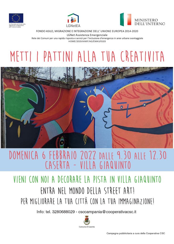 Sabato 5 febbraio, a partire dalle ore 9:30, saranno coinvolti nella raccolta delle arance amare promossa dal comitato per Villa Giaquinto. Si tratta di una iniziativa di solidarietà, che fa parte di una più ampia campagna di gestione dal basso dei beni comuni, finalizzata a rendere fruibile a tutti un parco pubblico. Domenica 6 febbraio, sempre alle ore 9:30, spazio alla creatività con la realizzazione di un murales lungo le pareti che costeggiano la pista di pattinaggio. All’iniziativa, promossa dalla cooperativa sociale ‘Credito senza confine’ – di cui è referente Hasnae Guettaya – parteciperanno anche gli Scout di Caserta che svolgeranno attività di animazione e intrattenimento. Saranno presenti anche alcuni rappresentanti del Comune, in qualità di ente capofila del progetto LGnet, finanziato dal Ministero dell’Interno. ‘Metti i pattini alla tua creatività. Migliora la tua città con la tua immaginazione’, questo lo slogan dell’evento che vedrà grandi e piccoli, italiani e stranieri, cimentarsi con la street art. Due iniziative di grande impatto sociale che consentiranno ai minori stranieri non accompagnati che vivono a Caserta di fare un ulteriore passo in avanti sulla strada dell’integrazione e dell’inclusione sociale per sentirsi parte attiva della comunità e contribuire alla crescita e allo sviluppo del territorio. Proprio da loro, giovanissimi migranti che vivono e studiano a Caserta, è partito in queste ore l’appello alla cittadinanza a partecipare numerosa ai due eventi. Due grandi occasioni di dialogo, cooperazione interculturale e confronto.
