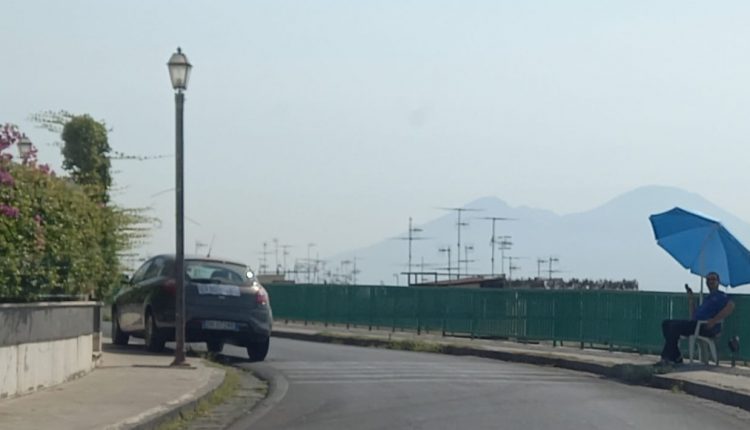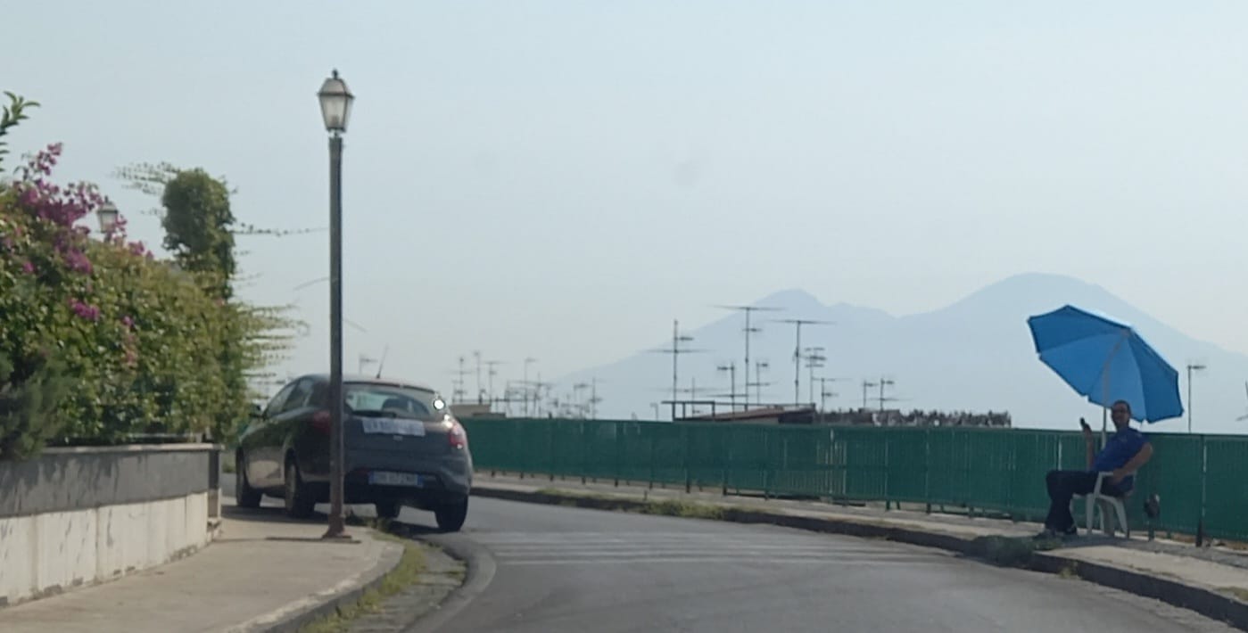 Una apparente guardia giurata (perché agli occhi del pubblico meno esperto questo appare) si nota più per la figura di un vero parcheggiatore abusivo in divisa con tanto di ombrellone ( stiamo in una zona da vip di Napoli, via Petrarca) che di un vigilante.